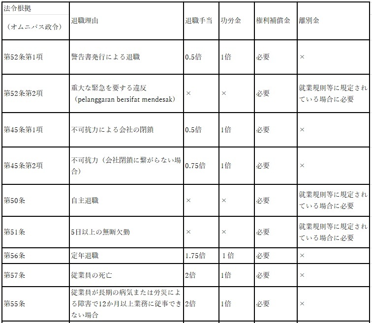 ・申請:退職手当(uang pisah)、権利補償手当(uang penggantian hak)、および功労金(uang penghargaan masa kerja)の計算方法や最低額が不明確であり、労働者が不当に少ない補償を受ける可能性がある。
